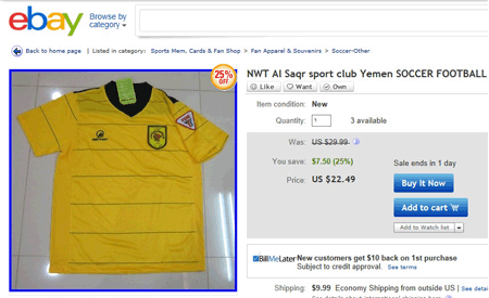 عرضت شركة أي باي - ebay - التسويقية العالمية عبر الإنتـرنت قميص فريق نادي الصقر الرياضي الثقافي على موقعها بسعر 22.49 $ , الجدير بالذكر أن شركة أي باي - ebay - وهي احدى شركات التسويق العالمية عبر شبكة الإنترنت والمعروف عنها بتسويقها لمختلف المنتجات ومنها ( الملابس الرياضية والأدوات الرياضية ) سبق لها أن قامت بتسويق قميص فريق الصقر في العام الماضي .. هذا ويعتبر قميص الصقر هو أول قميص على مستوى أندية بلادنا الذي يتم الترويج له وبيعه بهذا السعر ما يؤكد أن أنديتنا متى وصلت إلى النموذجية سيكون لها شأن كبير في الأسواق التجارية التي تستقطب العديد من الشركات للترويج لها وكذا الشباب المتابع داخل وخارج الوطن..